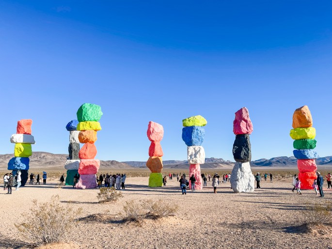Next we headed to the Seven Magic Mountains. It is a 30 mins drive from the the Las Vegas Strip. Seven Magic Mountains is a large-scale public art installation giving a creative expression of human presence in the desert as it punctuates the Mojave with a poetic burst of form and color. It is a creation of Internationally renowned Swiss artist Ugo Rondinone. However, it is understood that this Art Work is soon going to be dismantled and 2022 is probably the last year to catch a glimpse of this amazing piece of creativity.